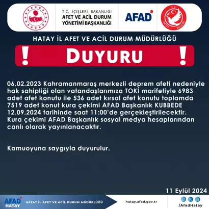Valilikten yapılan açıklamada; “6 Şubat Kahramanmaraş merkezli deprem afeti nedeniyle hak sahipliği olan vatandaşlarımıza TOKİ marifetiyle 6 bin 983 adet afet konutu ile 536 adet kırsal afet konutu toplamda 7 bin 519 adet konut kura çekimi AFAD Başkanlık KUBBEDE 12 Eylül’de saat 11:00’de gerçekleştirilecektir. Kura çekimi AFAD Başkanlık sosyal medya hesaplarından canlı olarak yayınlanacaktır” denildi.