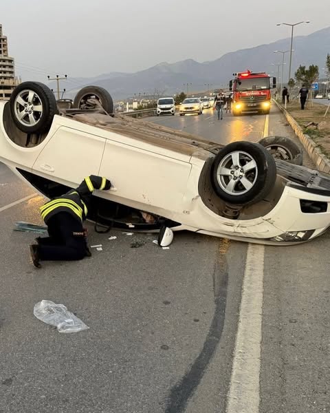 Arsuz çevre yolu üzerinde seyir halinde olan bir araç, sebebi henüz bilinmeyen bir trafik kazasıyla ters dönmüş hale geldi.