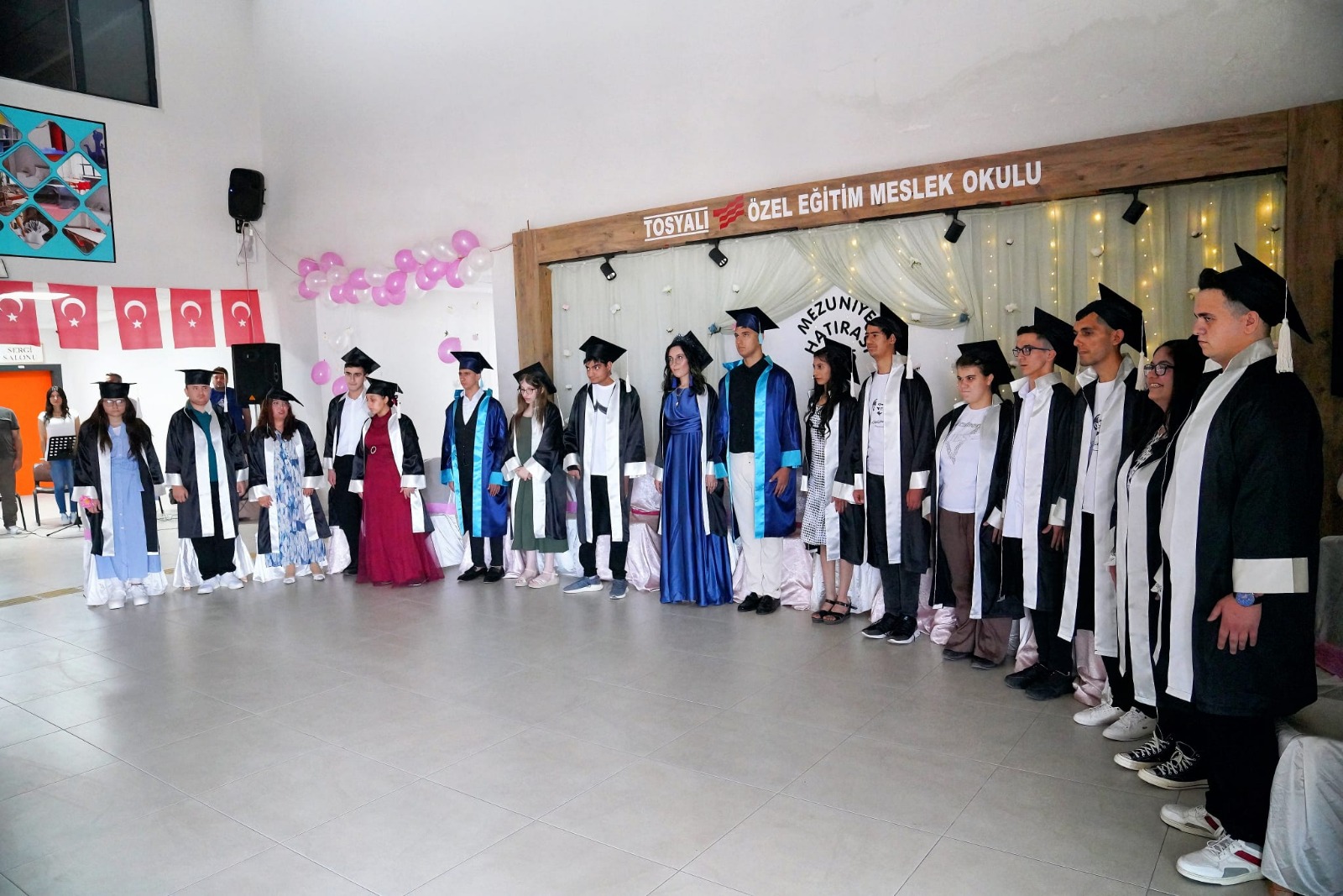 2024-2025 eğitim öğretim yılında Tosyalı Özel Eğitim Meslek Okulu’nda eğitimlerini tamamlayıp mezun olan 18 özel gereksinimli öğrenci için mezuniyet töreni düzenlendi.