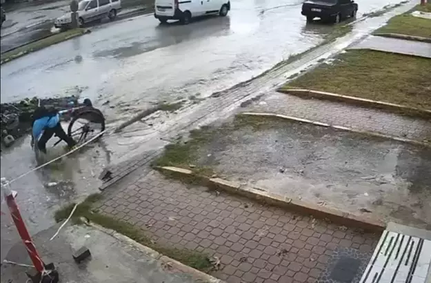 Dörtyol ilçesinde bir lise öğrencisi, yağışlı havada bisikletiyle yağmur suyu dolu 2 metre derinliğindeki çukura düştü. Çukurdan esnaf tarafından çıkarılan öğrencinin düşme anı güvenlik kamerasına yansıdı.