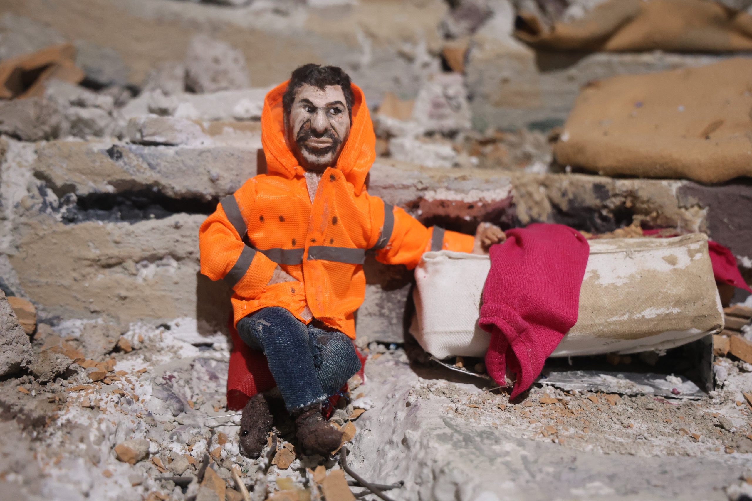 Depremden etkilenerek yaptığı makette atık malzemeleri kullanan ve çalışmayı 3 ay süren çalışmayla ortaya çıkardığını ifade eden Kocaman, “Bu deprem minyatürü yaparken özellikle geri dönüşüm malzemelerini kullandım. Satın aldığım sadece tutkal ve tel gibi malzemelerdi. Diğer karakterlerde aileleri enkaz altında kalmış ve onları yakınları çıkarmaya çalışıyorlar. Fotoğraflarda öyle görünüyor. Bu çalışmaya adını koymadım ama depremde simge fotoğraf haline gelmiş bir babanın hikayesi. Benimde depremde herkes gibi bir hikayem var. Depremde kardeşimi ve kuzenimi kaybettim. Depremde kardeşim hastanede görev yaparken enkaz altında kaldı. 10 gün boyunca enkaz altından çıkarmaya çalıştık ve başında kaldık. Dışarıdan gelen ekipler sayesinde yapılan çalışmayla kardeşimi 9’uncu günde cenazesini aldım. Deprem beni bayağı etkiledi. Deprem minyatürün yapımı ve figürler 3 ayımı aldı, bunun yanında yaşanılmış bütün olayları yapabiliyorum” ifadelerini kullandı.