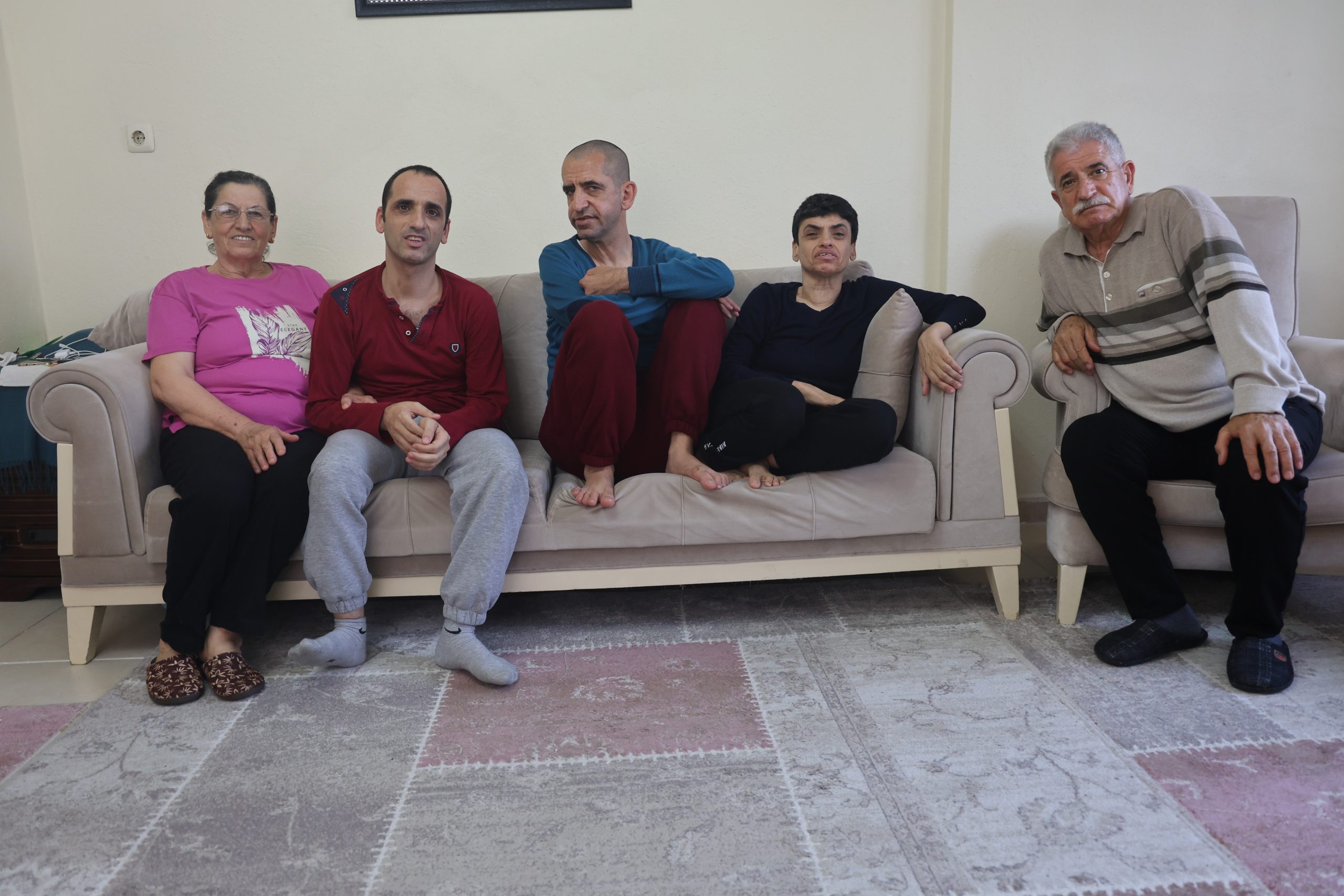 Antakya ilçesi Serinyol Mahallesi’nde yaşayan Edibe Koçak ile Kemal Koçak çiftinin çocukları 50 yaşındaki Orhan, 47 yaşındaki Melek ve 45 yaşındaki Yusuf, akraba evliliği nedeniyle zihinsel ve bedensel engelli olarak doğdu. Koçak çifti, engelli evlatlarına 50 yıldır usanmadan bakıyor. Anneler Günü’nü buruk geçiren anne Edibe Koçak, küçük oğlu Yusuf’un emekleyerek kendisine çiçek vermesinden dolayı çok mutlu olduğunu söyledi.