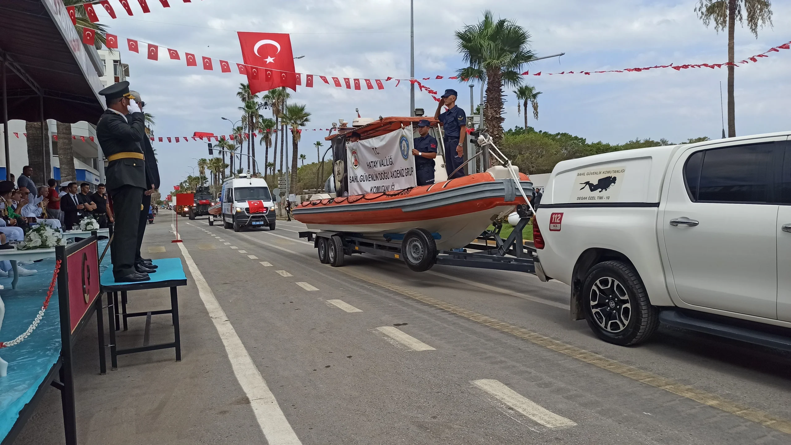 Halk oyunları gösterisinin ardından Türk bayrağı ve sancak taşıyan askerler ile öğrenciler, protokol ve töreni izleyen vatandaşlar tarafından ayakta alkışlandı. Resmigeçit töreninde; Türk Silahlı Kuvvetleri’ne bağlı özel birlikler, tam teçhizatlı askeri araçlar, güvenlik güçleri, kamu kurumlarının araçları, Yunus polis ekipleri, motosikletli zabıta ekipleri ve motosiklet kulüpleri geçiş yaptı. Her bir geçiş, vatandaşlar tarafından coşkuyla ve alkışlarla karşılandı.