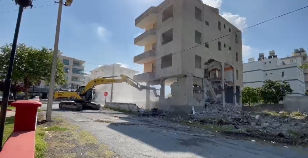 Hatay’ın Dörtyol ilçesinde 4 katlı binanın iş makinesinin darbesiyle yerle bir olduğu anlar kameraya yansıdı.