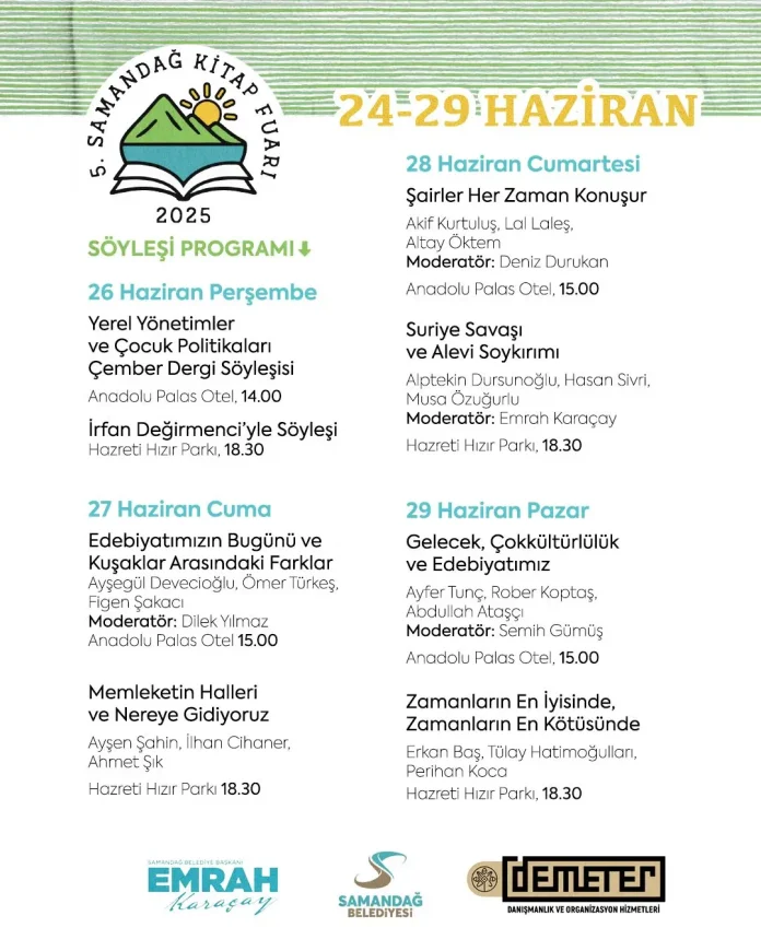 24-29 Haziran tarihleri arasında düzenlenecek olan 5. Samandağ Kitap Fuarı, birbirinden değerli yazar, şair ve gazetecilerin katılımıyla edebiyat ve toplumsal meseleleri buluşturan zengin bir söyleşi programına ev sahipliği yapacak.