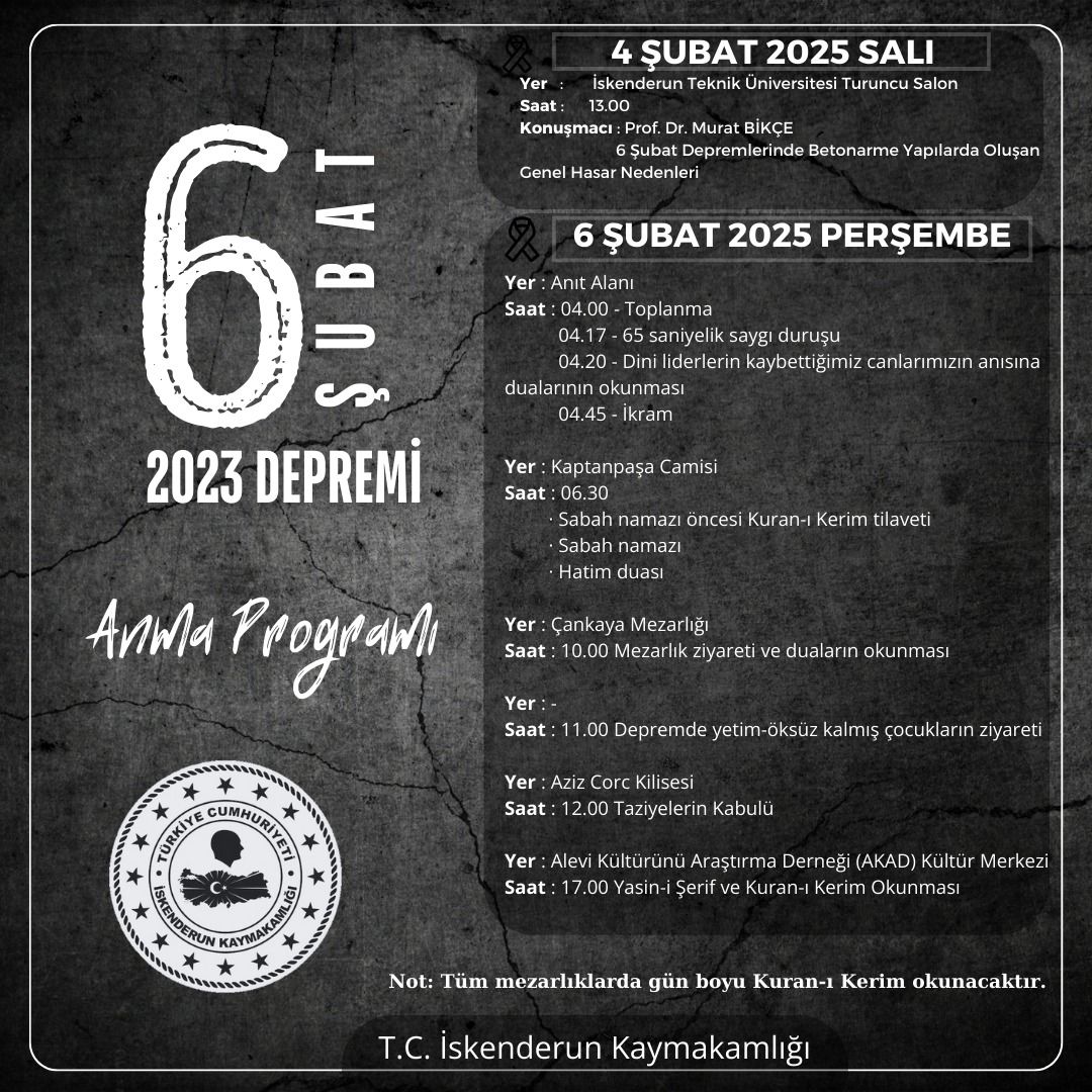 Tüm İskenderunluların davet edildiği anma programı, 6 Şubat 2025 Çarşamba günü saat 04.00’da Atatürk Anıt Alanında toplanılarak başlayacak. Saat tam 04.17’de depremde hayatını kaybeden vatandaşlarımız için 65 saniyelik saygı duruşunda bulunulacak.