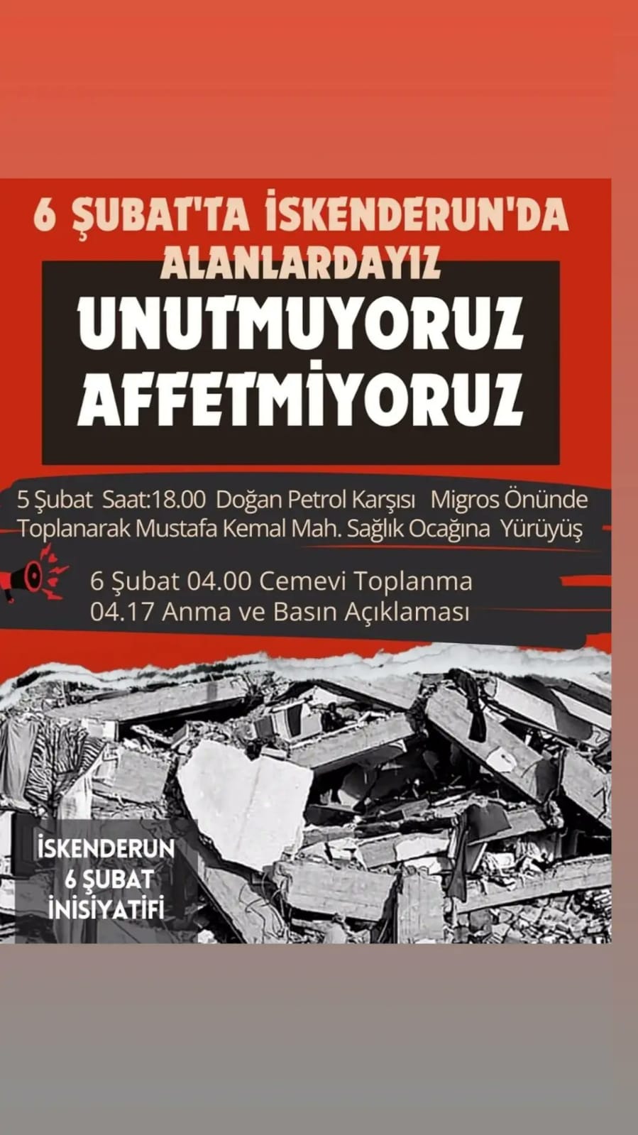 “1- Bu gün saat 18:00 de Doğan Petrol karşısında Migros önünde toplanıp Cemevi arkasındaki enkaz alanına kadar meşaleli yürüyüş ve bir depremzedenin yapacağı basın açıklaması sonrasında Cemevi karşısındaki Dayanışma Gönüllüleri çadırında dışarıdan gelen kurum temsilcilerinin kısa konuşmaları