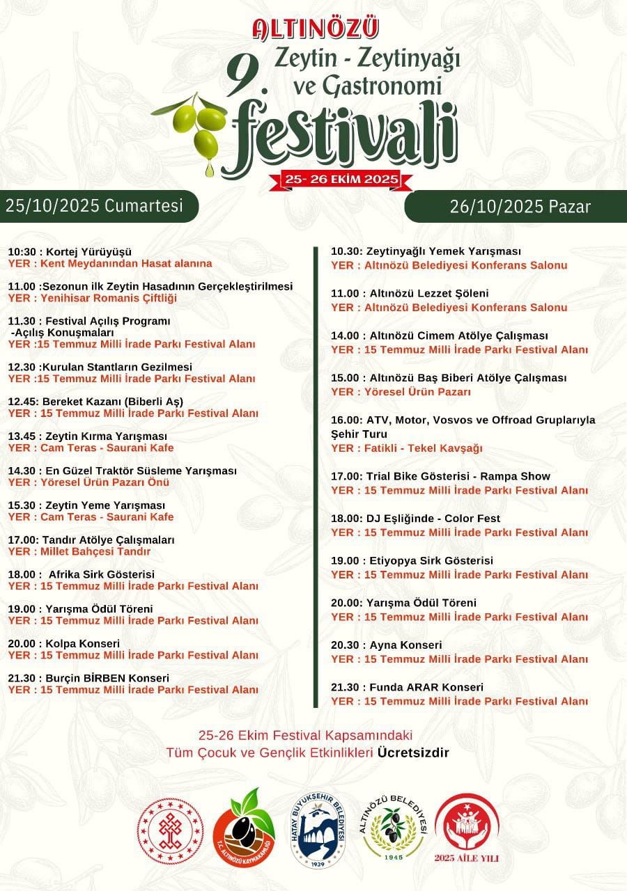 9. Altınözü Zeytin- Zeytinyağı ve Gastronomi Festivali birbirinden güzel etkinlik, yarışma, lezzet şovları ve konserlerle başlıyor.