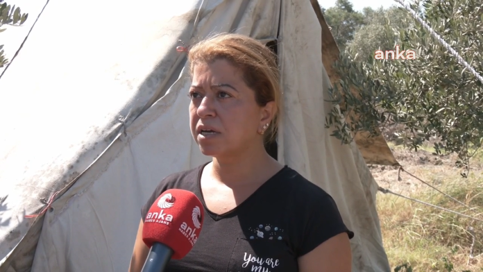 Kendilerine herhangi bir bildirim yapılmadan zeytin ağaçlarının sökülmeye başlandığını aktaran çiftçi Çiğdem Arslan, kalan ağaçlarının sökülmemesi için arazisinde çadır kurarak nöbet tutuyor.