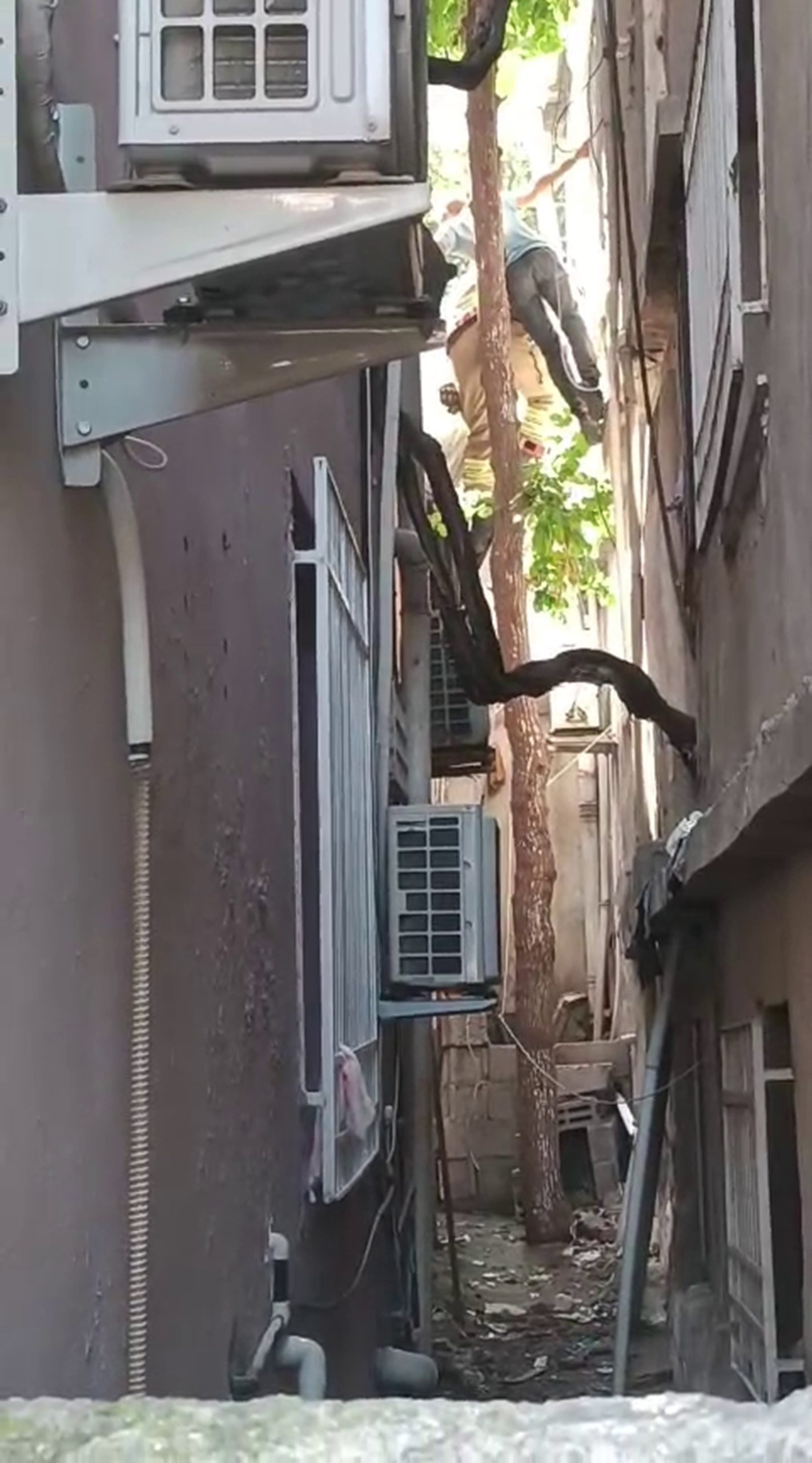Hatay’da dengesini kaybederek düşerken ağaçta asılı kalan adamı itfaiye ekipleri kurtardı.