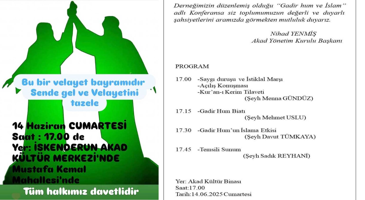 Alevi Kültürünü Araştırma Derneği (AKAD) Başkanı Nihat Yenmiş ve yönetim kurulu üyeleri, bayram dolayısıyla 14 Haziran Cumartesi günü saat:17’de Mustafa Kemal Mahallesi’ndeki AKAD Kültür Merkezi’nde Şeyh Menna Gündüz’ün Kuran-ı Kerim Tilaveti, Şeyh Mehmet Uslu’nun Gadir Hum Biatı, Şeyh Davut Tümkaya’nın Gadir Hum’un İslama etkisi ve Şeyh Sadık Reyhani’nin temsili sunumu ile düzenlenecek olan Gadir Hum ve İslam konulu konferansa herkesi davet etti.