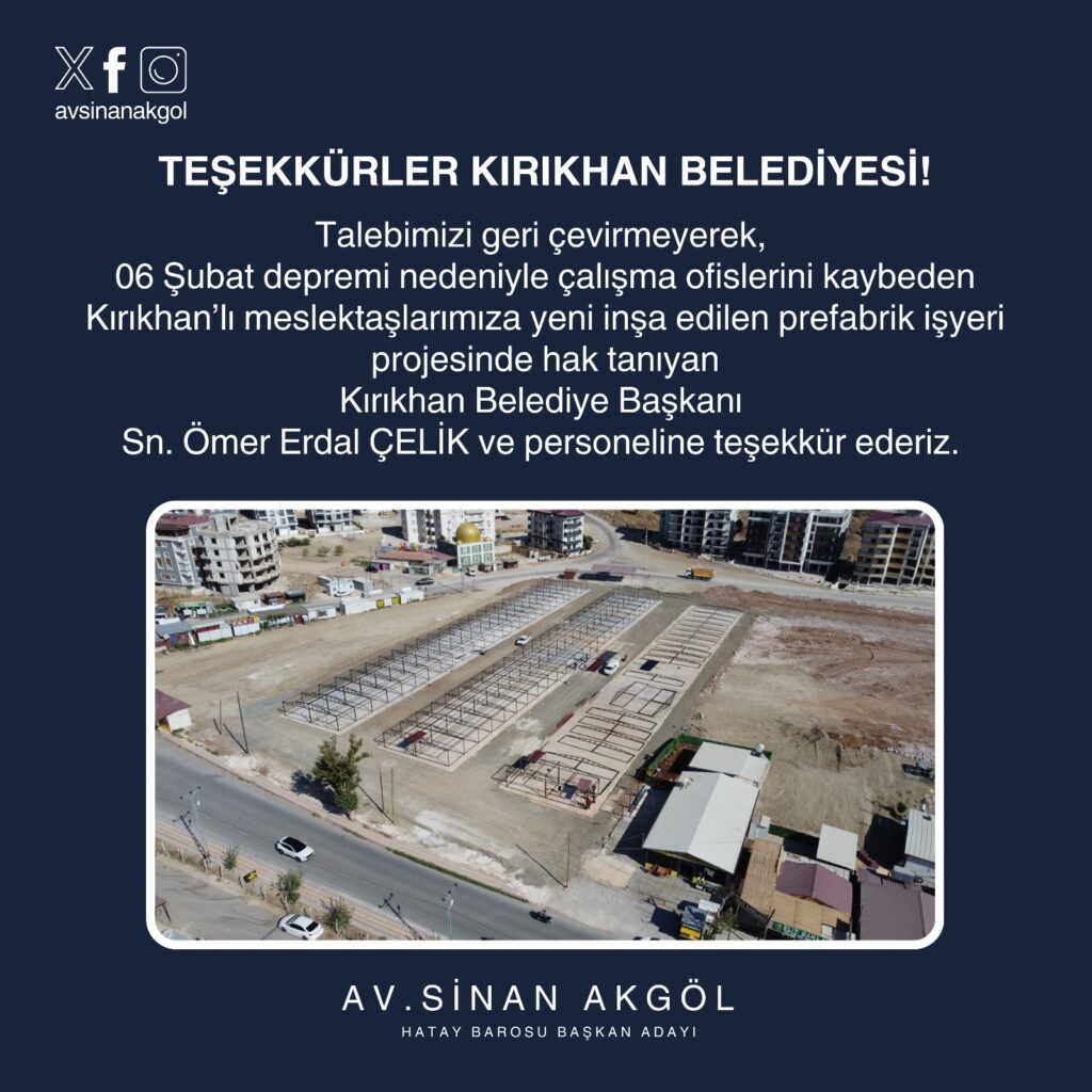 Baro Başkan Adayı Sinan Akgöl, sosyal medya hesabından yaptığı açıklamada, “Talebimizi geri çevirmeyerek, 6 Şubat depremi nedeniyle çalışma ofislerini kaybeden Kırıkhanlı meslektaşlarımıza yeni inşa edilen prefabrik işyeri projesinde hak tanıyan Kırıkhan Belediye Başkanı Ömer Erdal Çelik ve personeline teşekkür ederiz” dedi.
