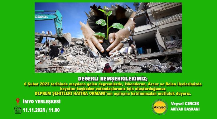 11 Kasım 2024 Pazartesi ‘Dünya Ağaçlandırma Günü’nde saat 11.00’de, İSTE Meslek Yüksek Okulu yerleşkesinde hizmete açılacak hatıra ormanında, İskenderun, Arsuz ve Belen’de, depremde hayatını kaybeden her bir vatandaşımız için bir fidan dikileceğini ve bu fidanların üzerine isimlerinin yazılı olduğu metal levhalar asılacağını ifade eden AKİYAD Başkanı Veysel Cıncık, tüm halkımızı bu anlamlı etkinliğe davet etti.