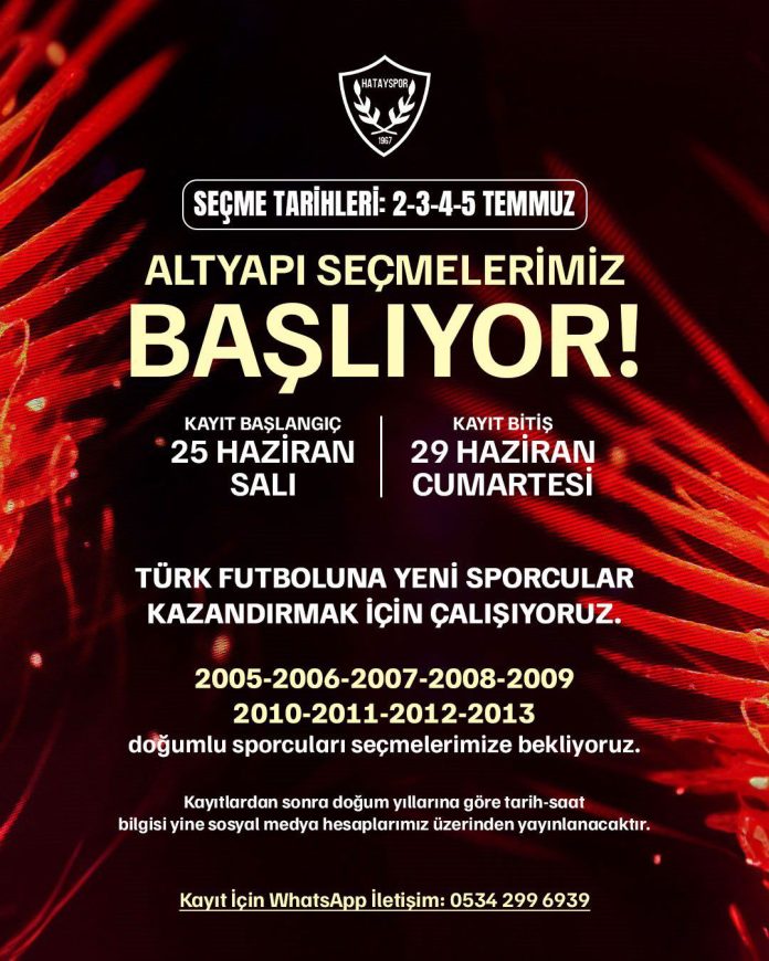 Hatayspor’un alt yapı seçimleri için kayıtlar başlıyor. Kayıtlar 25 Haziran’da başlayacak ve 29 Haziran Cumartesi günü sona erecek. Katılmak isteyen sporcular için lisans zorunluluğu bulunmamakla birlikte, seçilen futbolcuların lisans işlemleri mevcut kulüpleriyle çözülecek.