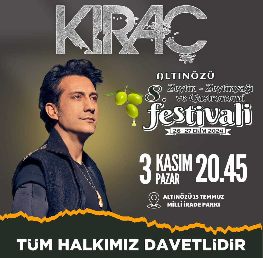 Zeytin ve zeytinyağının eşsiz lezzetlerinin yanı sıra Altınözü halkı ve ziyaretçileri Kıraç’ın unutulmaz şarkılarıyla eğlenceli bir akşam geçirecek.