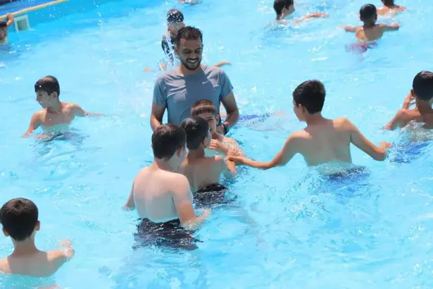 Hatay Valiliği tarafından başlatılan “Yüreğimizdeki Işık Projesi” kapsamında Altınözü Kaymakamlığı organizasyonu ile “Geleceğe Kulaç Atıyoruz” isimli yüzme etkinliğinde Altınözülü gençler yüzmeyi öğreniyor.