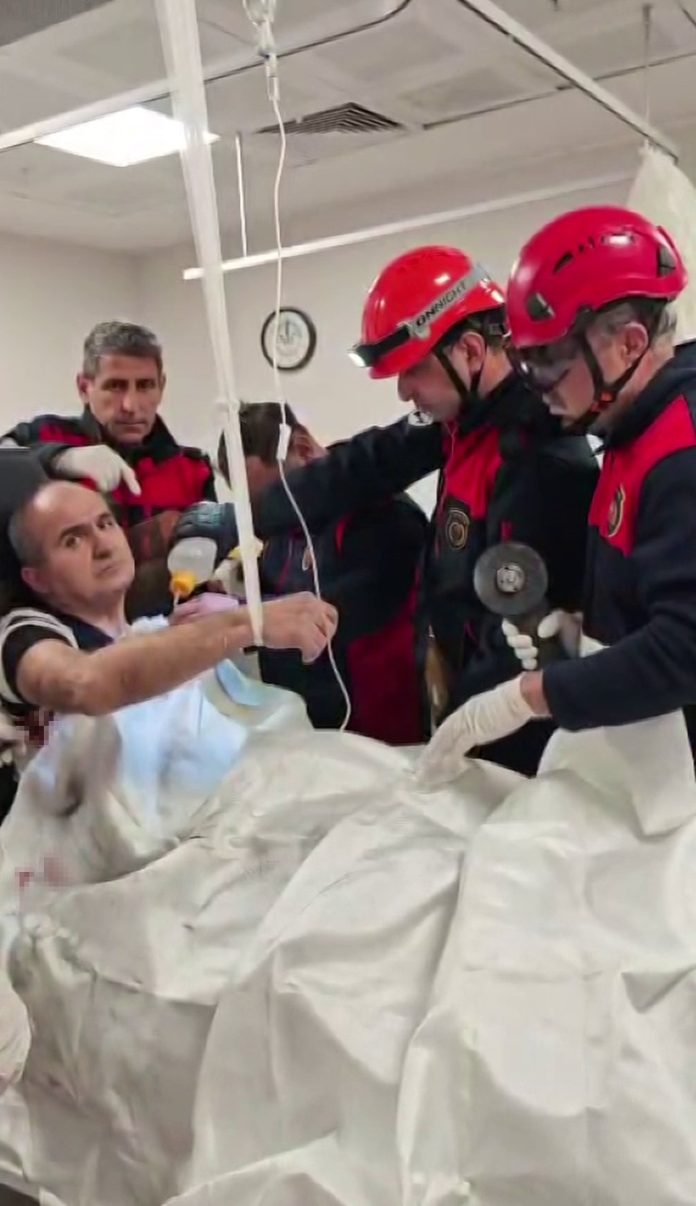 HATAY’DA GÖĞSÜNE SAPLANAN DEMİRLE HASTANEYE KALDIRILAN ŞAHSIN VÜCUDUNDAKİ DEMİR İTFAİYE EKİPLERİ TARAFINDAN KESİLEREK ÇIKARILDI. (ESMA KURAL/HATAY-İHA)