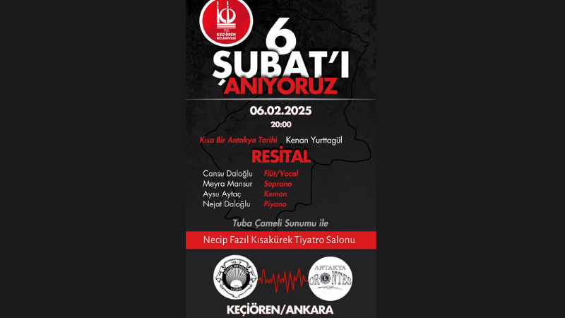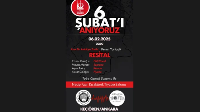 Hatay’da Kahramanmaraş merkezli depremin 2.yıl dönümünde, Ankara’nın Keçiören ilçesi Necip Fazıl Kısakürek Tiyatro Salonu’nda, 6 şubat Perşembe günü akşam saat 8’de anma programı gerçekleştirilecek.