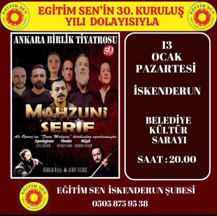 Eğitim-Sen, kuruluşunun 30. yıldönümü dolayısıyla güzel bir etkinliğe daha imza atıyor. Bu doğrultuda, Ankara Birlik Tiyatrosunca sergilenen ‘Mahsuni Şerif’ oyunu İskenderun‘da sahne alacak.