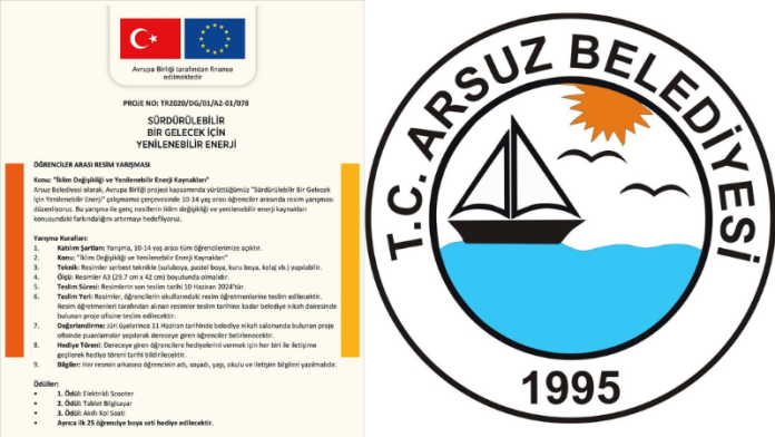 Arsuz Belediyesi, Avrupa Birliği projesi kapsamında, “Sürdürülebilir Bir Gelecek İçin Yenilenebilir Enerji” çalışması başlatıyor. Bu kapsamda düzenlenen resim yarışmasıyla 10-14 yaş arası öğrenciler, iklim değişikliği ve yenilenebilir enerji kaynakları konusunda farkındalık oluşturuyor.