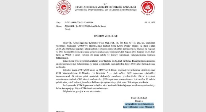 20068401 Ruhsat Nolu Krom Ocağı’nın iptali ile ilgili Çevresel Etki Değerlendirmesi, İzin ve Denetim Genel Müdürlüğü’nden yapılan açıklama şöyle, “Hatay İli, Arsuz İlçesi’nde Krommer Mad. Mer. Nak. İth. İhr. San. ve Tic. Ltd. Şti. tarafından yapılması planlanan “20068401 (Er:3112220) Ruhsat Nolu Krom Ocağı” projesi ile ilgili olarak 28.05.2024 tarihinde yapılan Halkın Katılım Toplantısı sonucu halktan gelen görüş ve öneriler ile Kapsam ve Özel Format Belirlemesi sonucu komisyonca kapsamı belirlenen ÇED Raporu Özel Formatı yazımız proje sahibi ve dosyayı hazırlayan yetkilendirilmiş kuruluşa bildirilmiştir. Bahse konu proje ile ilgili hazırlanan ÇED Raporu 03.07.2025 tarihinde Bakanlığımıza sunulmuş ancak formata uygun bulunmaması ve rapor içeriğindeki eksikliklerden dolayı 10.07.2025 tarihinde iade edilmiştir. Bilindiği üzere, 29.07.2022 tarihli ve 31907 sayılı Resmi Gazetede yayımlanarak yürürlüğe giren ÇED Yönetmeliğinin 11.Maddesi (1) Bendinde “…… İade edilen ÇED raporunun eksiklikleri tamamlanarak 30 takvim günü içerisinde Bakanlığa sunulması gerekmektedir. Süresi içerisinde sunulmaması halinde ÇED süreci sonlandırılır. ÇED raporunun tamamlanması için verilen ‘30 takvim’ hükmü yer almaktadır. Günlük süre yetkili müşavir firmaların kullanacağı toplam süreyi ifade eder. Bu kapsamda, ÇED Raporunun belirtilen süre içerisinde Bakanlığımıza sunulmamasından dolayı bahse konu projeye ilişkin ÇED süreci sonlandırılmıştır.”