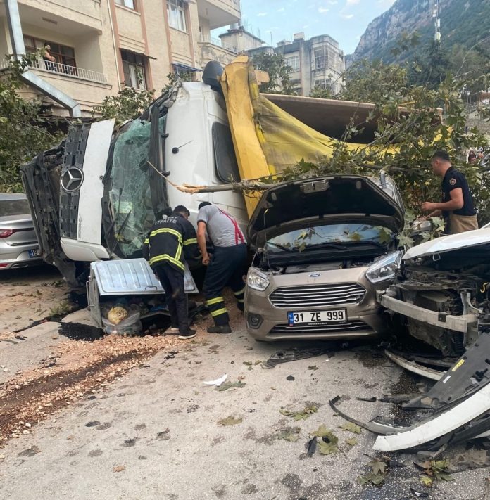 Defne ilçesinde freni patlayan bir hafriyat kamyonu 7 araca çarparak durabildi.