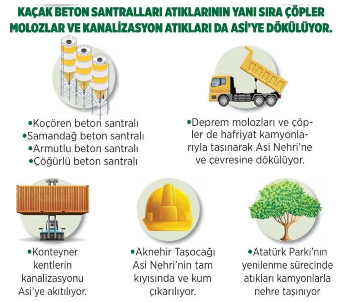 Antakya Çevre Koruma Derneği Başkanı Nilgün Karasu, Asi Nehri’ne en büyük zararı beton santrallarının ve taşocaklarının verdiğini kaydetti. Karasu, BirGün’e şöyle konuştu: “Asi Nehri depremden önce çok büyük bir kirliliğe maruz kaldı, depremden sonra da bu katlandı. Yaşam alanlarının ve konteynerkentlerin kanalizasyonu Asi’ye bırakılıyor. Ayrıca çevresindeki beton santralları ve taşocaklarının tüm pisliği de nehre akıtıyor.