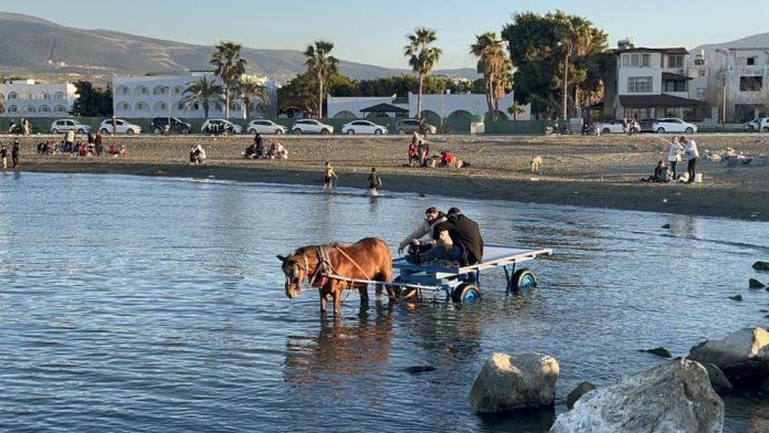 Ocak ayında güneşli havanın tadını çıkarmak isteyenler, Arsuz ilçesinde sahillere akın etti. Karaağaç mevkisinde güneşli havanın tadını çıkarmak isteyen 2 kafadar, at arabasıyla denize girdi. İlginç olayda üstleri ıslanmadan denizin ortasında keyif çatan 2 vatandaşın o anları kameraya yansıdı. Vatandaşların meraklı bakışları arasında denizin içinde at arabası üzerinde güneşlenen şahısların o anları hayrete düşürdü.