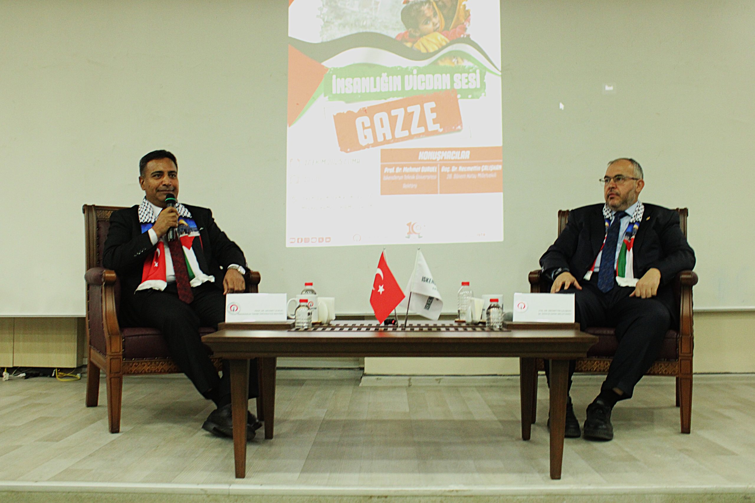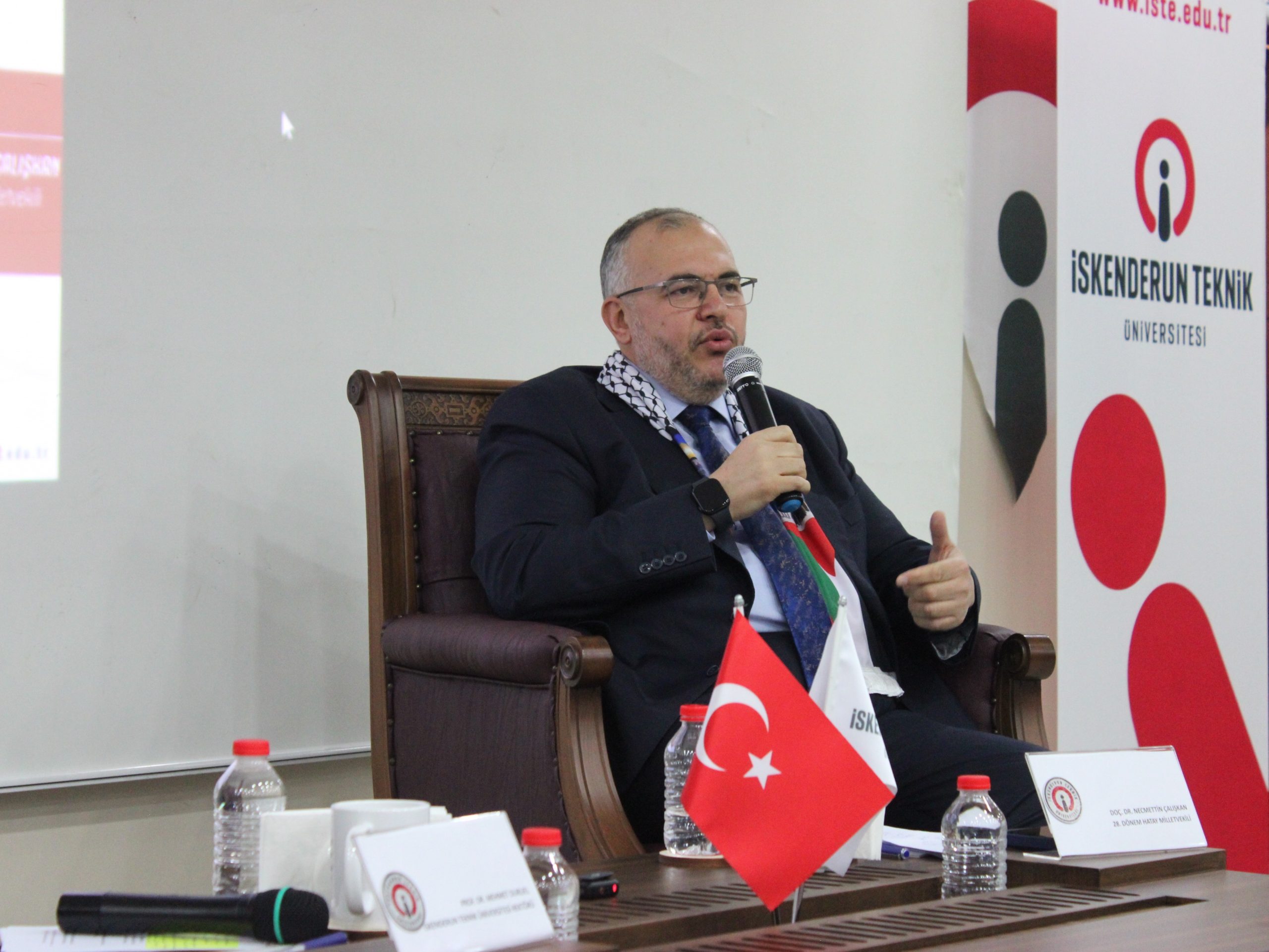 İskenderun Teknik Üniversitesi (İSTE)’nde Gazze’ye yönelik soykırım ve siyonist rejimin eylemlerinin sonuçları ve İsrail ile Filistin savaşına yönelik konferans düzenlendi. Konferansta misafir konuşmacı olarak katılan ve Sumud Filosu’nda Filistin’e yola çıkan Saadet Partisi Hatay Milletvekili Necmettin Çalışkan, İskenderun’a döndüğü ilk fırsatta kamuya aktaracağı önemli hususlar için yerini aldı. Çalışkan, ”Sumud Filosu’nda zor anlar yaşadık, siyasilerin desteği ile kurtarıldık. STK’lardan ve halktan aldığımız destek ile bugün bu konferansta sizlerleyim’‘ dedi.