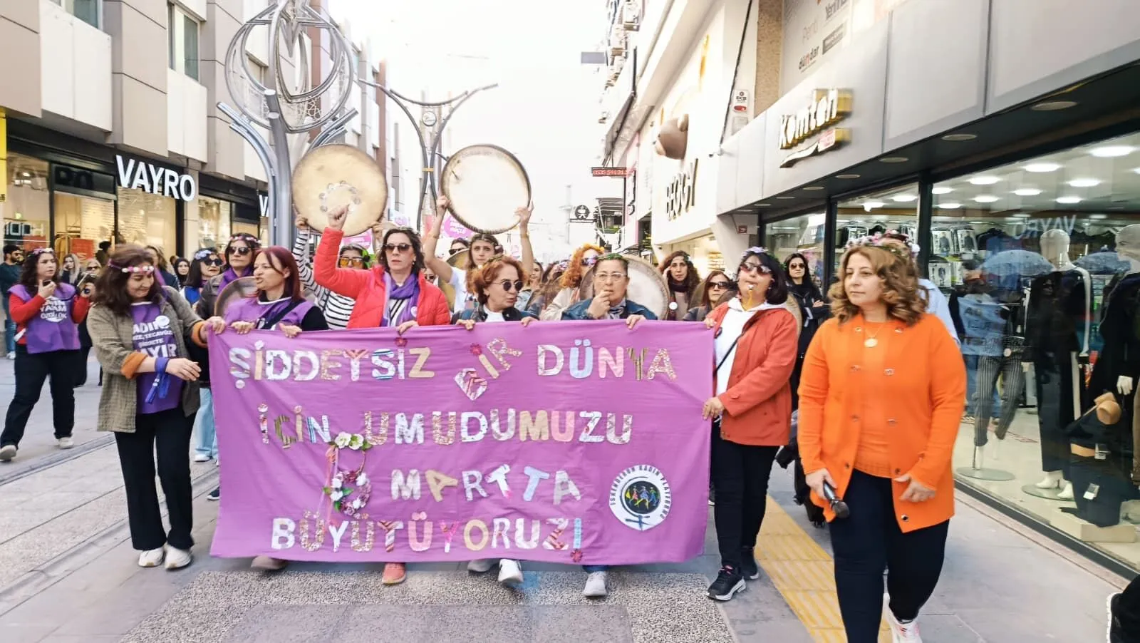 Renkli kıyafetleri, taşıdıkları dövizler ve attıkları sloganlarla yürüyüşe katılan kadınlar, alkış ve zılgıtlarla alanı doldurdu. Bu arada Kadınlar Türkçe, Arapça ve Kürtçe şarkılar seslendirdi, halaylar çekti. Kadınlar ekonomik krize, şiddete, savaşa, eşitsizliğe ve kazanılmış haklara yönelik saldırılara karşı birlik mesajı verdi.