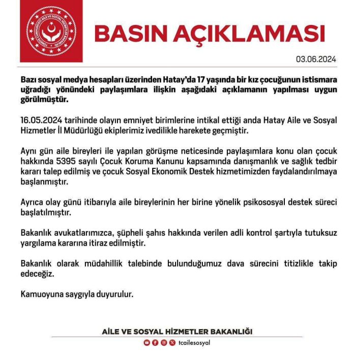 Bakanlıktan, bazı sosyal medya hesaplarından Hatay’da 17 yaşında bir kız çocuğunun istismara uğradığı yönündeki paylaşımlara ilişkin açıklama yapıldı.