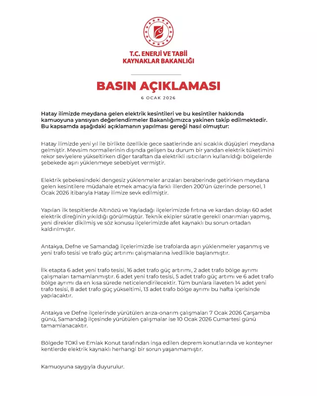 Bakanlık tarafından yapılan açıklamada şu ifadelere yer verildi: “Hatay ilimizde meydana gelen elektrik kesintileri ve bu kesintiler hakkında kamuoyuna yansıyan değerlendirmeler Bakanlığımızca yakinen takip edilmektedir.