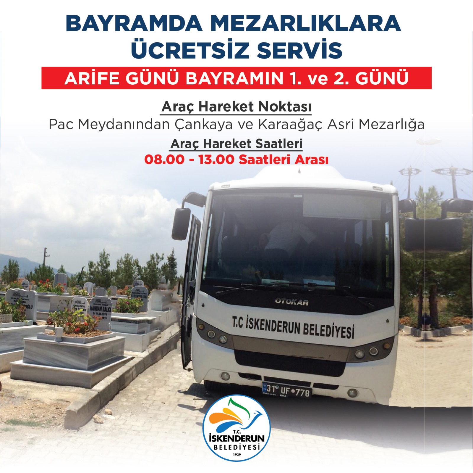 İskenderun Belediyesi tarafından halkımızın mezarlık ziyaretleri için bayram arifesi, bayramın birinci ve ikinci günü ücretsiz ring otobüs seferleri düzenlenecek.