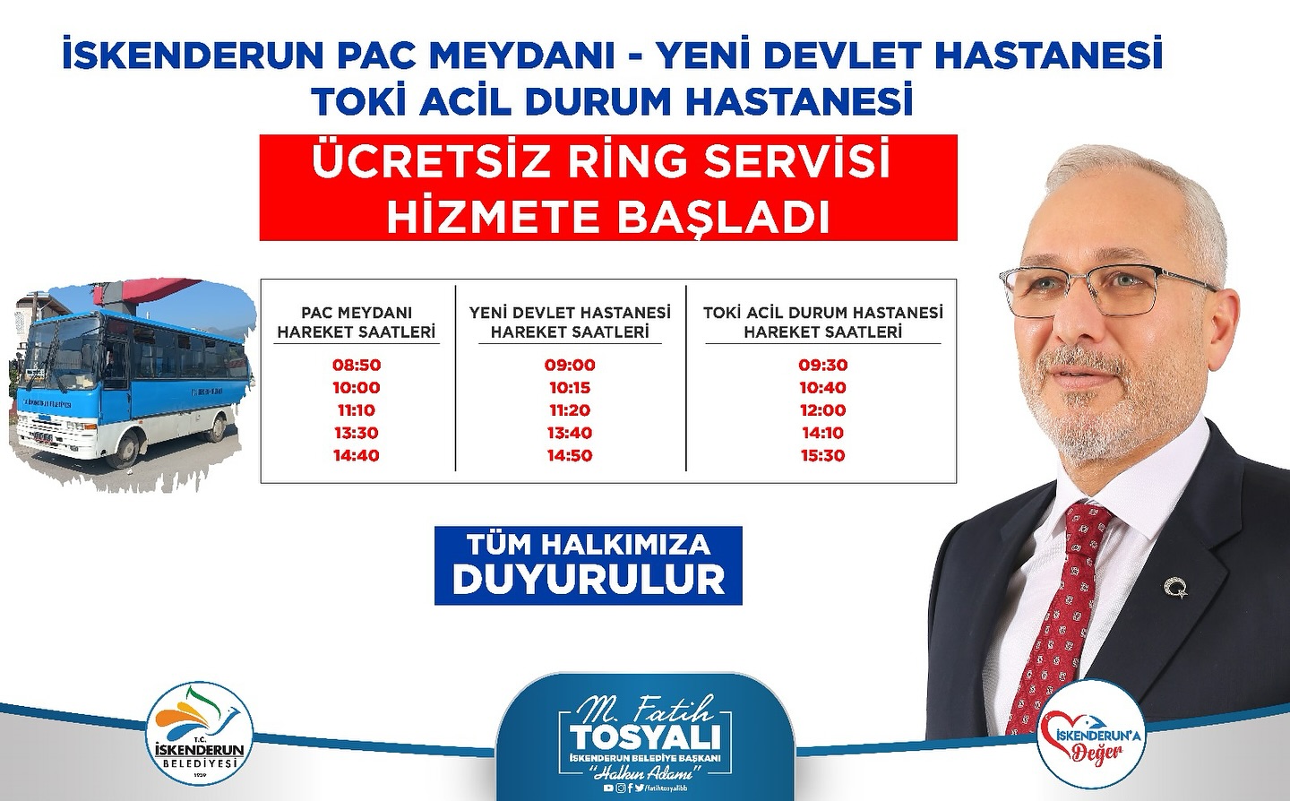 “Kıymetli Hemşerilerimiz için PAC MEYDANI-YENİ DEVLET HASTANESİ-ACİL DURUM HASTANESİ arasında ücretsiz Ring Servisi Hizmetimiz Başlamıştır. Ücretsiz Ring Servislerimiz 08.50-16.00 saatleri arasında 5 tur dönüşümlü olarak hareket edecektir. Hastanelere ulaşım konusunda vatandaşlarımız büyük bir sıkıntı çekiyordu. Bizlerde vatandaşlarımızdan gelen yoğun talepler doğrultusunda böyle bir hizmete başladık. Bu hizmet sayesinde hasta, yaşlı, engelli ve aracı olmayan birçok vatandaşımız bu hizmetten faydalanıyor”
