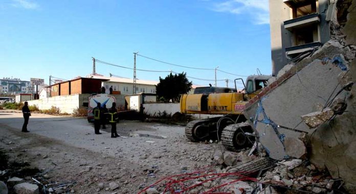 Saraycık Mahallesi’nde yıkım kararı verilen ağır hasarlı bina, kontrollü yıkım çalışması sırasında iş makinesinin üzerine devrildi. İş makinesinin bir kısmı enkaz altında kalırken, operatör araçtan atlayarak kurtuldu.