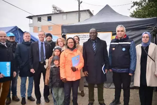 Hatay Harap Arası Konteyner Yerleşim Alanı’nı ziyaret eden BM Türkiye Mukim Koordinatörü Dr. Babatunde Ahonsi, burada yürütülen çalışmalarla ilgili bilgi aldıktan sonra konteynerde eğitim alan çocuklarla bir araya geldi. Çeşitli oyunlarla akran zorbalığının anlatıldığı derse katılan Ahonsi, çocuklarla tek tek tanışıp sohbet etti. Bir çocuk, İngilizce ‘Hoş geldin’ diyerek Ahonsi ile tokalaştı. Ahonsi ve beraberindeki heyet daha sonra UNDP destekli Hatay Erişilebilir Toplum Merkezi’ne geçti.