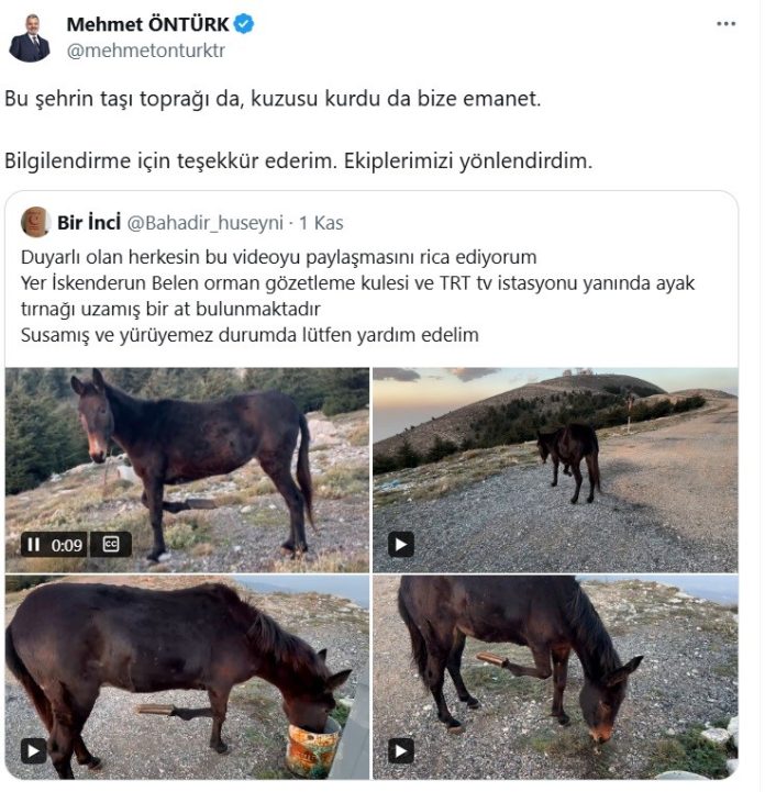 Hatay Büyükşehir Belediyesi, sosyal medya üzerinden paylaşılan ve yardıma muhtaç olduğu görülen bin 900 rakımdaki katırı bularak koruma altına aldı. Başkan Öntürk’ün, ‘Bu şehrin taşı toprağı da, kuzusu kurdu da bize emanet’ sözleriyle hayvana ulaşılacağını söylemesiyse takdir topladı.