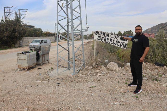 HATAY’DA YAŞADIĞI MAHALLEYİ TEMİZ OLMASI İÇİN UĞRAŞAN ALİ TANCI, MAHALLEDE YAŞAYAN İNSANLARIN ÇÖP KONTEYNERLARINA ÇÖP ATMAMASINA ‘BURAYA ÇÖP ATAN ŞEREFSİZDİR’ YAZILI TABELASINI ASARAK ÇÖZÜM BULDU. (RAMAZAN İLIN/HATAY-İHA)