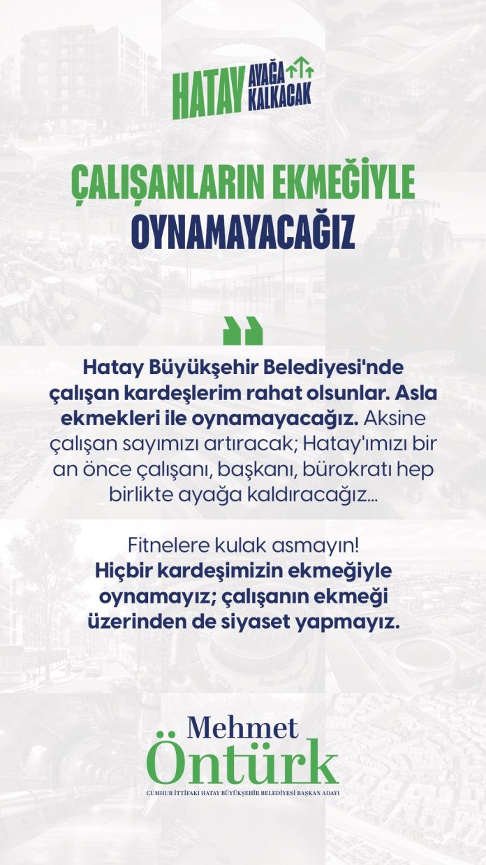 Cumhur İttifakı HBB adayı Mehmet Öntürk net mesaj verdi”Tüm Hatay Büyükşehir Belediye çalışanları kardeşlerim rahat olsunlar. Asla ekmekleri ile oynamayacağız. Aksine çalışan sayımızı artıracak, Hatay’ımızı bir an önce ayağa kaldıracağız.
