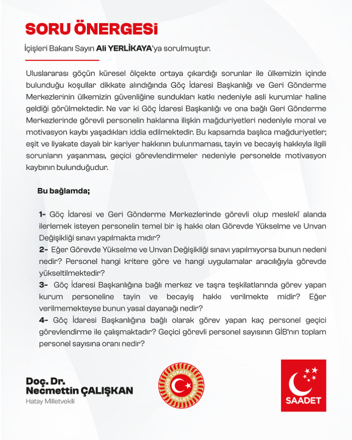 Son olarak, Saadet Partisi Hatay Milletvekili Doç. Dr. Necmettin Çalışkan, İçişleri Bakanı Ali Yerlikaya’ya seslenerek, Göç İdaresi ve Geri Gönderme Merkezlerinde görev yapan personelin haklarının korunması ve mağduriyetlerinin giderilmesi için acil adımlar atılması gerektiğini belirtti. Çalışkan, personelin motivasyon kaybı yaşamadan, daha verimli çalışabilmeleri için gerekli düzenlemelerin yapılmasını talep etti.