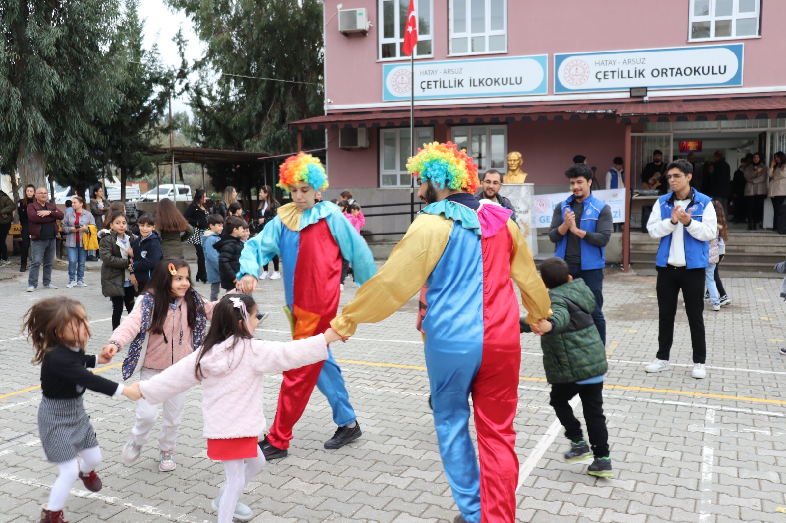 Çocukların karne heyecanına ortak olan İskenderun Gençlik Merkezi’nin ilk durağı Çetillik İlkokul’u oldu. Müzik eşliğinde Palyaçolarla birlikte dans eden çocuklar yerel sanatçımız Soydan SOYDAŞ’ın konseriyle keyifli anlar yaşadı.