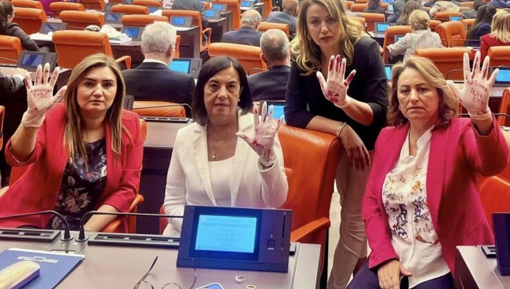 Aralarında CHP Hatay milletvekilleri Nermin Yıldırım Kara ve Servet Mullaoğlu’nun da bulunduğu, Genel Kurul’da yasa teklifini ellerine giydikleri üzerinde ‘Katliama dur de’ kırmızı boyalı eldivenlerle protesto etti.