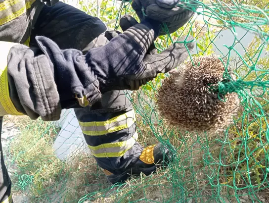 Samandağ ilçesinde çit filesine dolanan bir kirpi, itfaiye ekiplerinin müdahalesiyle kurtarıldı.