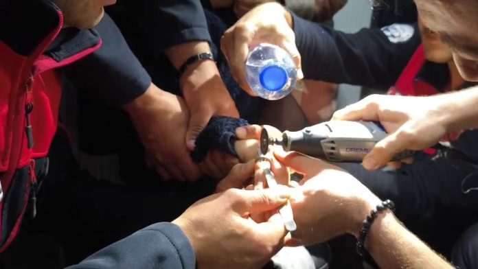 Hatay’da oyun oynarken çocuğun parmağına sıkışan yüzük, itfaiye ekipleri tarafından kesilerek çıkartıldı. Yüzük çıkarma operasyonu esnasında ‘korkuyorum’ diyerek gözyaşlarına boğulan çocuğu itfaiye ekipleri ve annesi teselli etti.