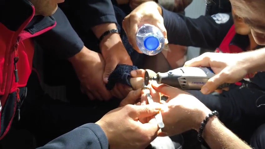 oyun oynarken çocuğun parmağına sıkışan yüzük, itfaiye ekipleri tarafından kesilerek çıkartıldı. Yüzük çıkarma operasyonu esnasında ‘korkuyorum’ diyerek gözyaşlarına boğulan çocuğu itfaiye ekipleri ve annesi teselli etti.