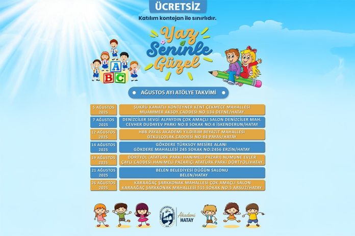 HBB İnsan Kaynakları ve Eğitim Dairesi Başkanlığı, Akademi Hatay tarafından “Yaz Seninle Güzel” sloganıyla organize edilen çocuklara yönelik ücretsiz atölyelerini Ağustos ayı boyunca Arsuz, Belen, Defne, Dörtyol, Erzin, İskenderun, Payas’ta devam ettirecek.