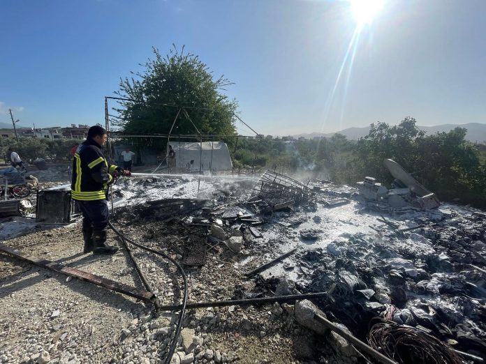 Defne ilçesinde çadırkent yangın cıktı 3 çadır tamamen yanarak kül olurken çevredeki çadırlar da kısmen zarar gördü.