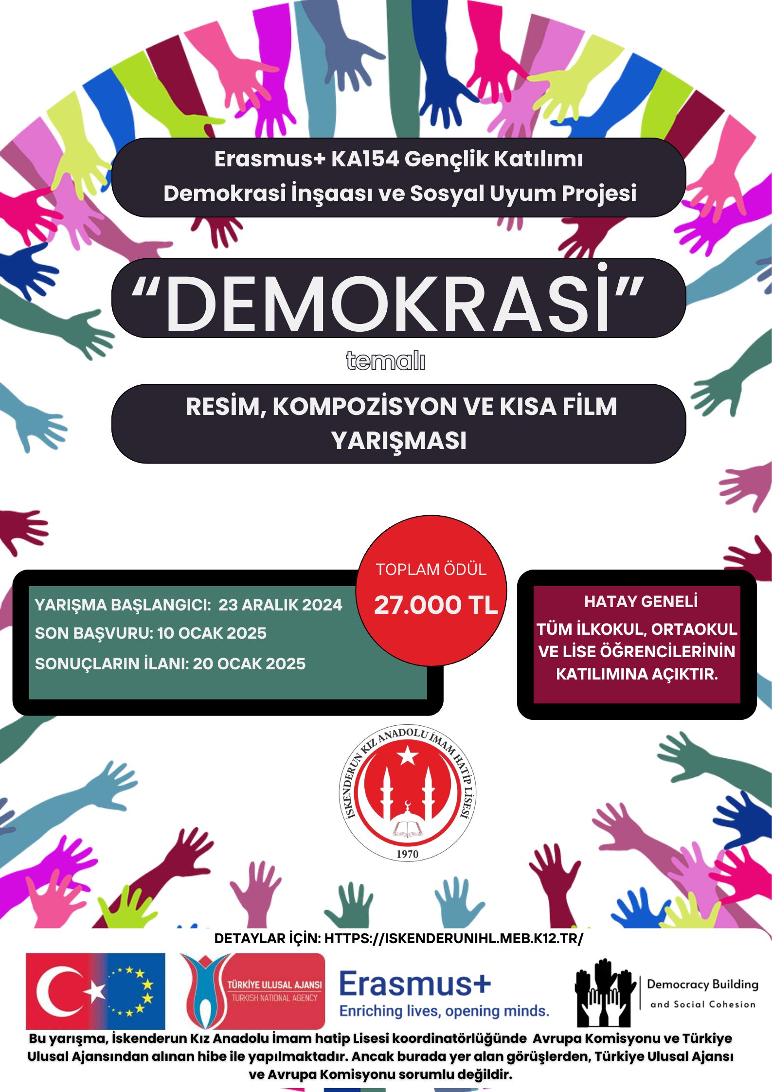 İskenderun Kız Anadolu İmam Hatip Lisesi koordinatörlüğünde yürütülen, Türkiye Ulusal Ajansı ve Avrupa Komisyonu tarafından Erasmus+ Ka154 projeleri kapsamında desteklenen Demokrasi İnşaası ve Sosyal Uyum isimli proje kapsamında, Hatay geneli ilkokul, ortaokul ve lise öğrencilerinin katılımına açık DEMOKRASİ temalı resim, kompozisyon ve kısa film yarışması başladı.