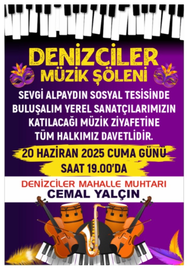 İskenderun ilcesinde bulunan Denizciler Sevgi Alpaydın Sosyal Tesislerinde 20 Haziran Cuma Günü saat: 19.00’da düzenlenecek etkinliğe yerel sanatçıların katılacağını belirten Muhtar Cemal Yalçın; “2025-2026 Eğitim öğretim yılı sona erdi. Tüm öğrencilerimize ve eğitim camiamıza hayırlı olsun. Böylesi bir günde öğrencilerimizi ve velilerimizi düzenlediğimiz Müzik şölenimize davet ediyoruz. Birlik ve beraberliğimizi pekiştirecek olan etkinliğimizde öğrencilerimizde yoğun geçen eğitim öğretimin stresini de atmış olacaklar” dedi.