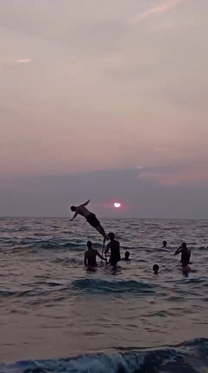 HATAY’IN ARSUZ İLÇESİNE BAĞLI KARAAĞAÇ MAHALLESİ’NDE SICAK HAVALARIN ETKİSİNİ ARTIRMASIYLA VATANDAŞLAR SERİNLEMEK İÇİN PLAJLARA AKIN ETTİ. İLGİNÇ SERİNLEME YÖNTEMİ İSE RENKLİ GÖRÜNTÜLERE SAHNE OLDU. (OGÜN ASLAN/HATAY-İHA)
